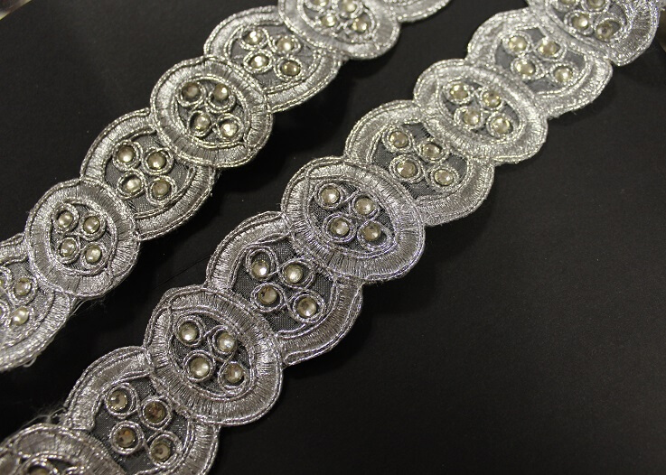 Adorno tipo entredos de unos 5 cms para vestidos de pedreria hace flor en tonos plata. Ideal para complementar vestidos, bandas, bolsos, etc.