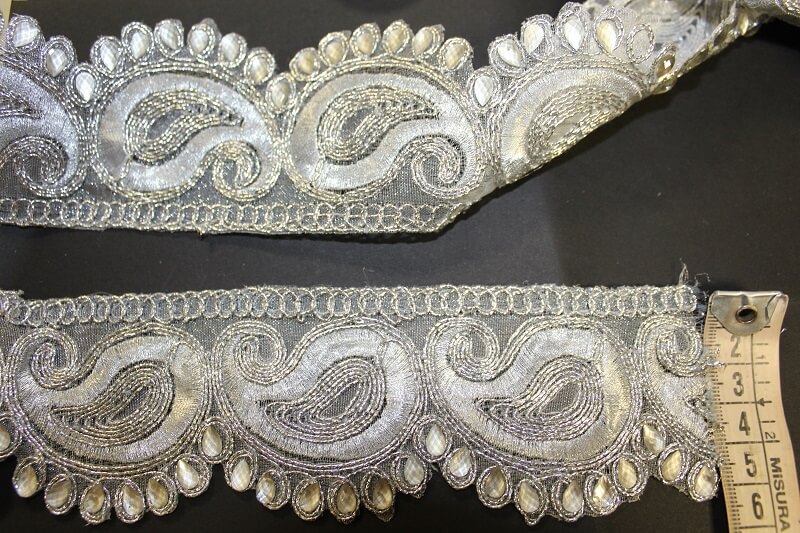 Adorno para el complemento del vestir, fantasia, gotas que simulan el cristal hace dibujo de cashemir de unos 6 cms de ancho. Ideal para customizar vestidos, bolsos, etc.