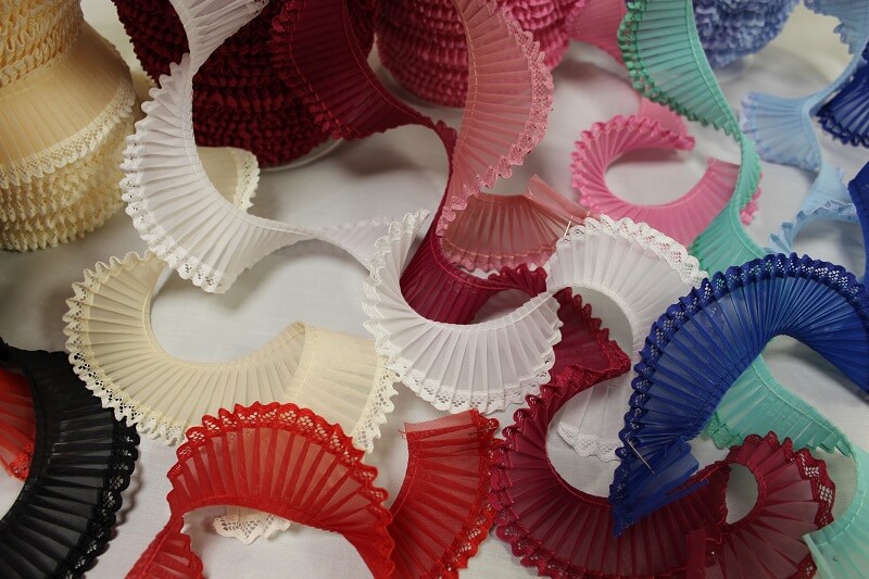 Adorno pisado con puntilla nylon al flino. Mide unos 6 cms. Va cosido al filo de los volantes dando volumen y realzando el vestido o traje de flamenca que lo lleva. Muy usado para aplicaciones infantiles, ceremonias, flamenca, etc.