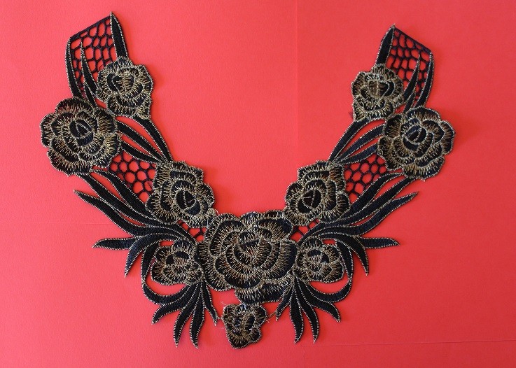 Aplicación bordada de color negro y dorado. Ideal para escotes de vestidos.