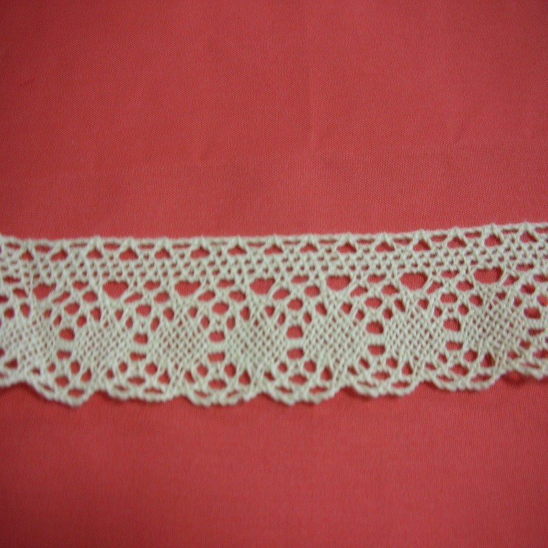 Encaje de bolillo de tamaño mediano de unos 5 cms aprox. Usado para decorar muebles, adorno de tapetes y caminos de mesa. Para confección en general, flamenca, etc.