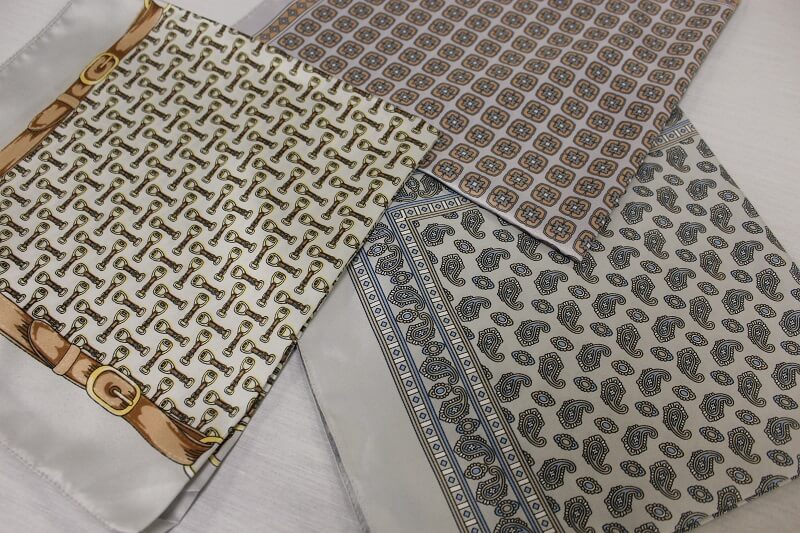 Pañuelo en tonos grises, varios modelos, con dibujos de cashimir, cuadros simetricos, estribos. Tres opciones a elegir.