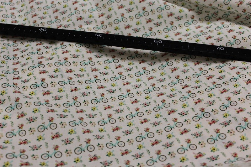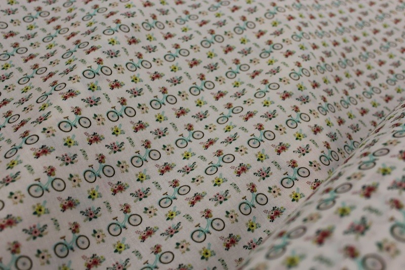 Tejido batista algodón con estampación de bicicletas pequeñas. Ideal para confección infantíl, manualidades, mascarillas, etc.