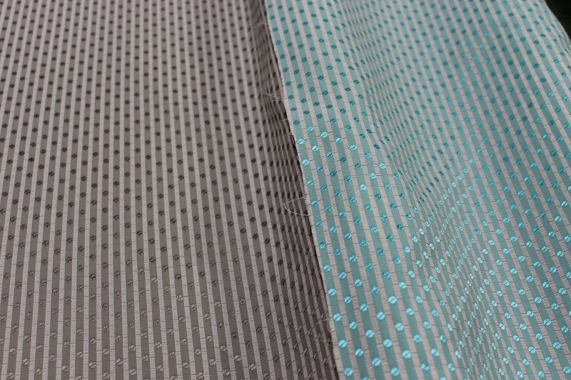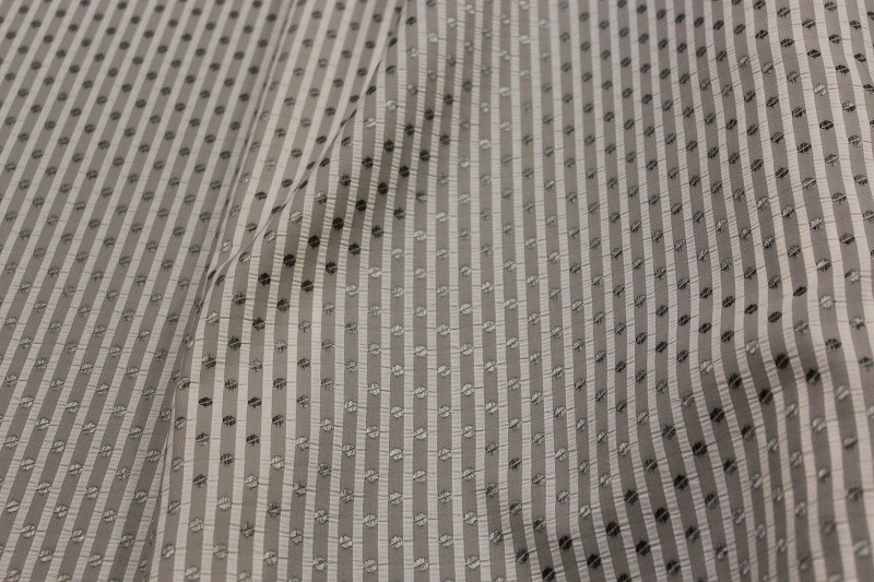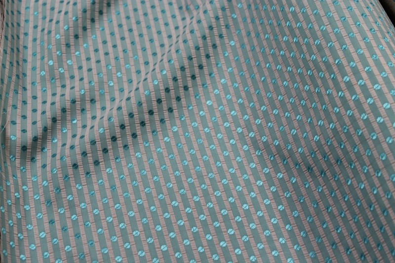 Tejido con bordado en forma de lunar de unos 3 mm de diámetro aprox. Tela ideal para vestidos de fiesta y ceremonias, vestidos de arras, fajines y para complementos. Disponible en dos tonos; gris ó verde agua.