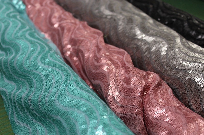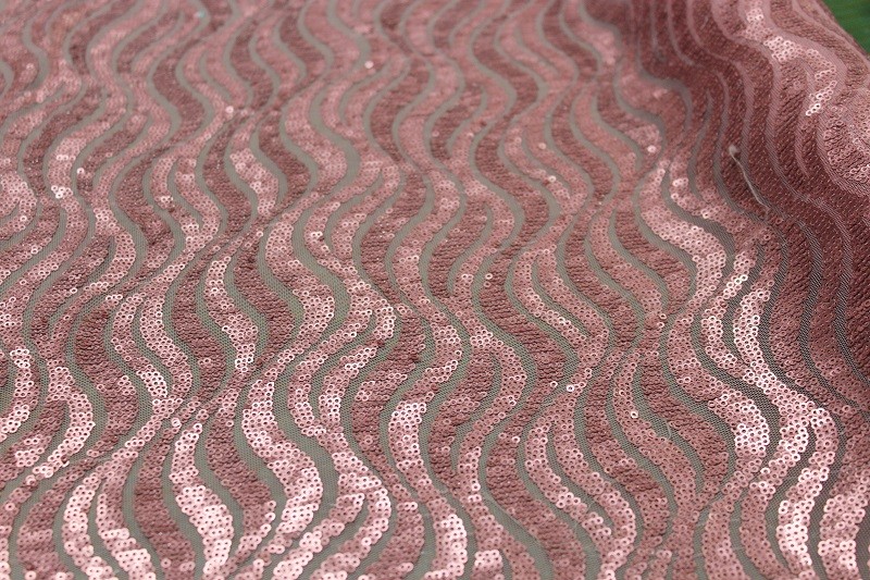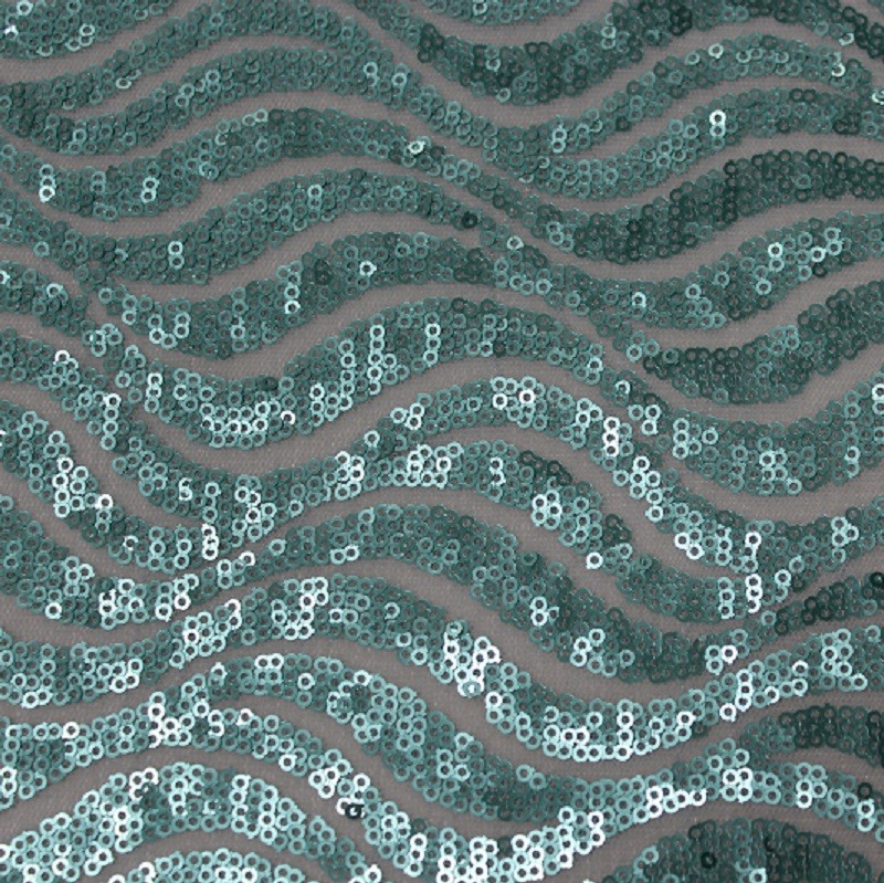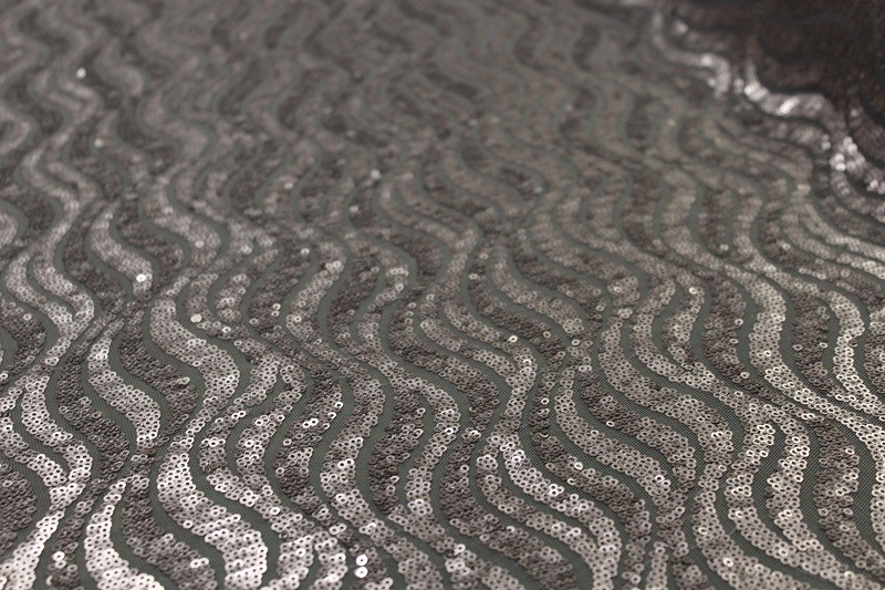 Tejido lentejuelas haciendo ondas sobre una base de tul. Ideal para confección de vestidos de fiesta y ceremonias. Trajes largos y cortos, para noche ó día.