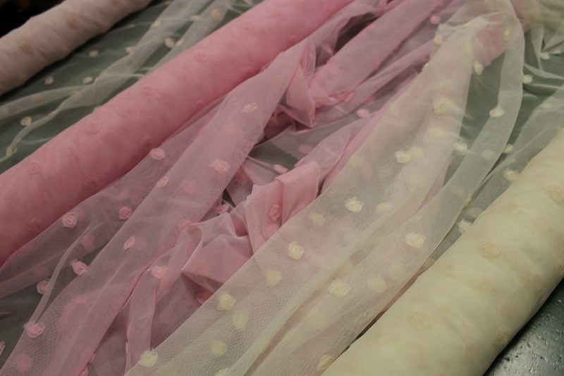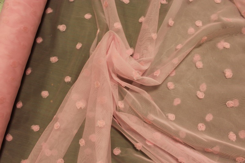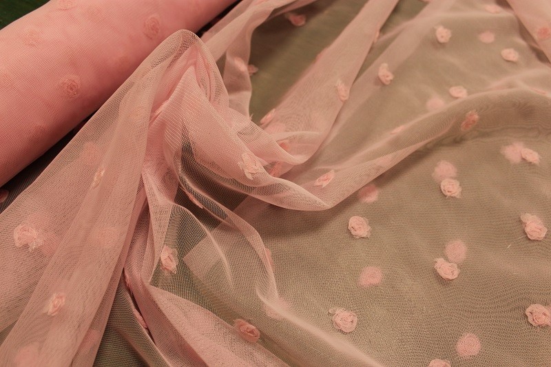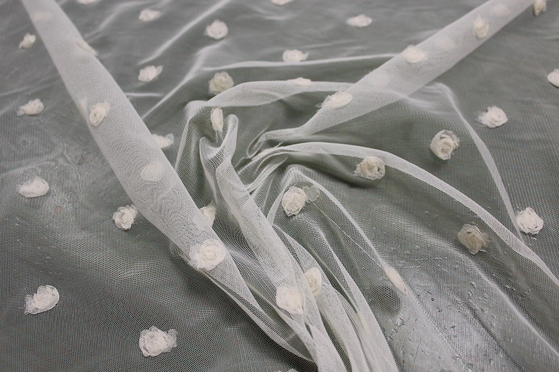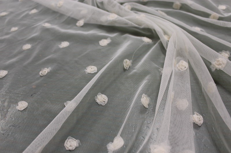 Tejido de tul con aplicación de flor roseta pequeña haciendo la decoración del tejido. Con mucha caida. Fiesta, comunión, cristianar, etc.