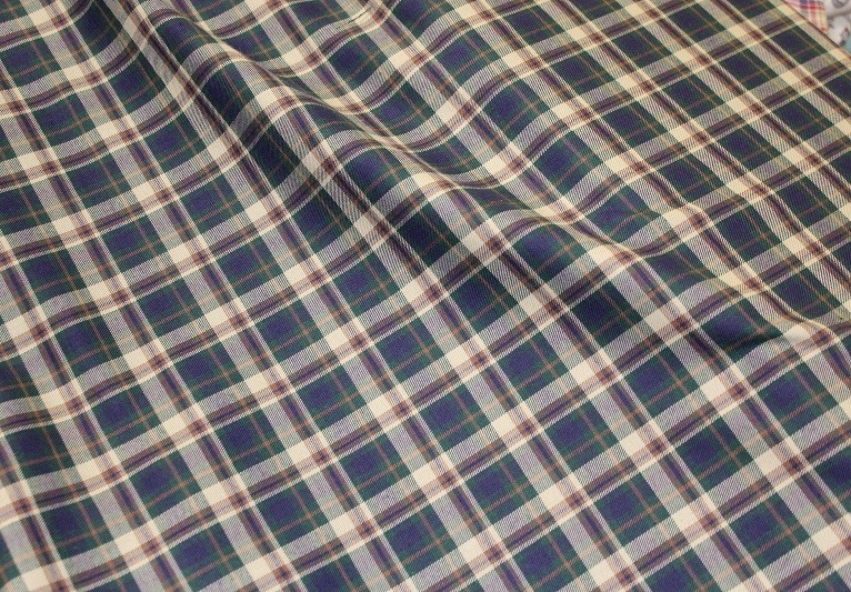 Tejido de cuadros tipo villela colores azul, verde, marfil. Ideal para confección en general, pichis, faldas, pantalones, etc.