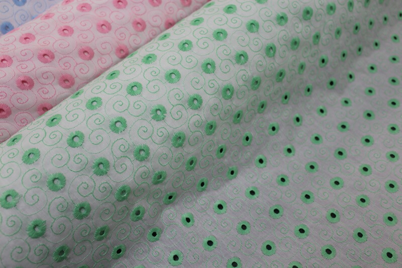 Tela batista perforada haciendo agujeros bordados de hilo del color de cada muestra. Ideal para confección de vestidos o trajes de flamenca infantíl, adultos. Vestidos de verano, faldas, confección infantíl, pichis, peleles…