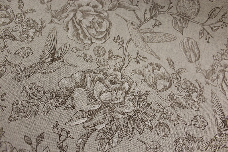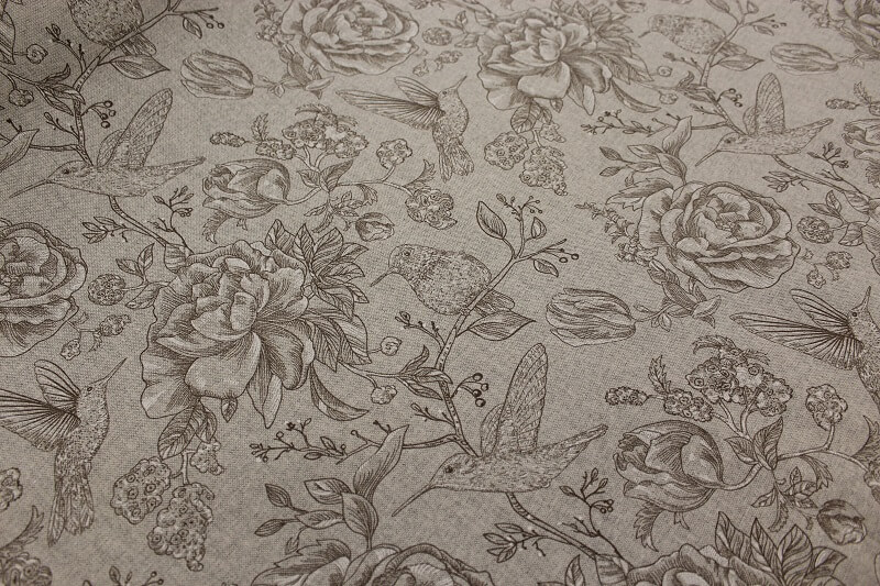 Tela de panamá resinada teflon con estampación de flores y pájaros en tonos beig, suaves. Dibujo discreto, facil de combinar. Ideal para confección de manteles, cojines o colchonetas para exterior, etc. Ancho 140 cms.