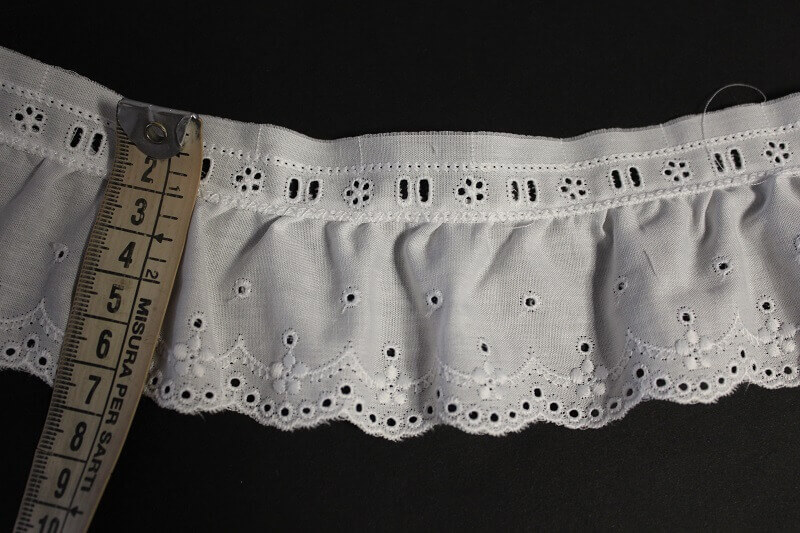Tira bordada fruncida con entredos y pasacinta para lazo de 6 mm Color blanco. De unos 7 cms de ancho aproximadamente, ideal para adornar vestidos, volantes, escotes, delantales, volantes para trajes de flamenca, etc.