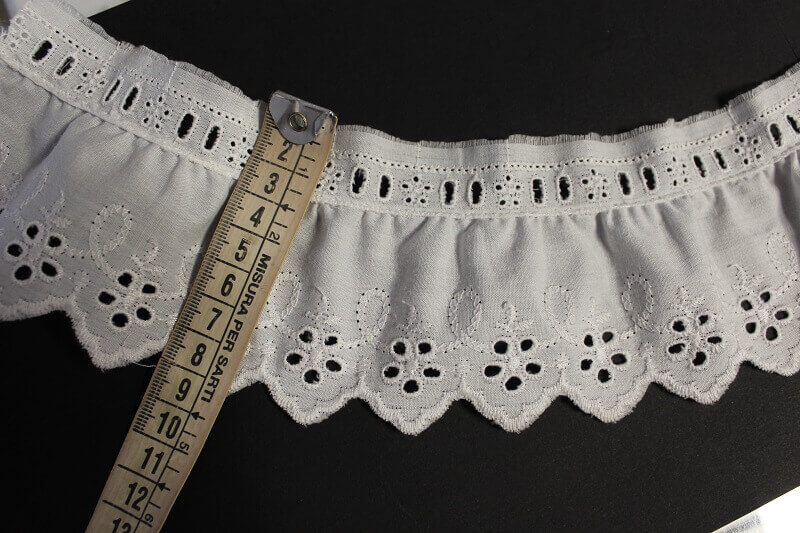 Tira bordada fruncida con entredos y pasacinta para lazo de 6, 8 ó 9 mm Color blanco. De unos 9 cms de ancho aproximadamente, ideal para adornar vestidos, volantes, escotes, delantales, volantes para trajes de flamenca, etc.