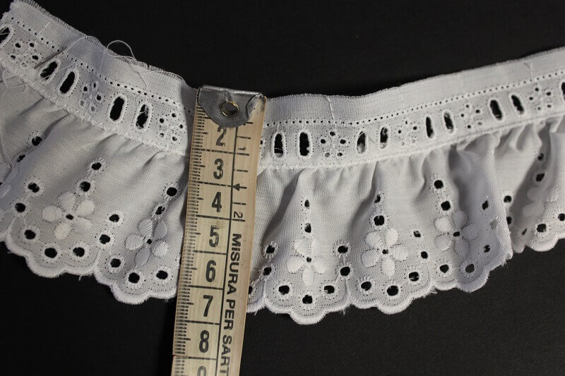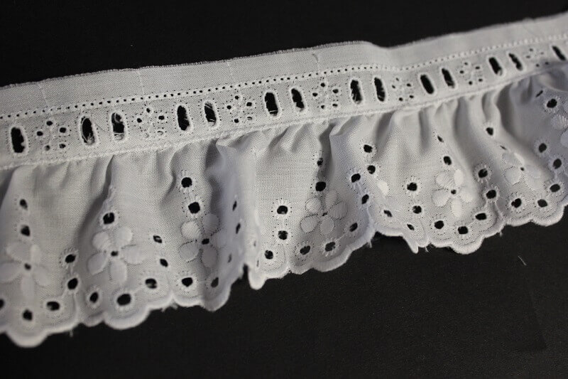Tira bordada fruncida con entredos y pasacinta para lazo de 6, 8 ó 9 mm Color blanco. De unos 7 cms de ancho aproximadamente, ideal para adornar vestidos, volantes, escotes, delantales, volantes para trajes de flamenca, etc.
