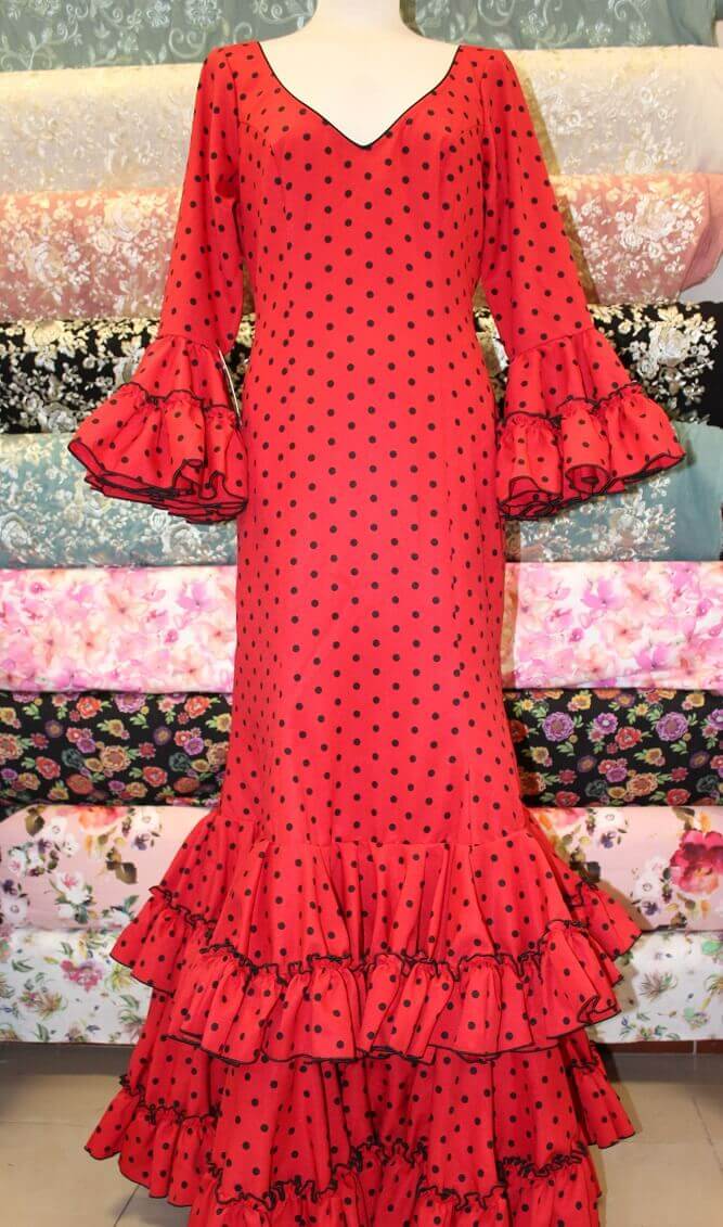 Traje de flamenca confeccionado en tela de estrech lunar de unos 7 ú 8 mm en negro sobre fondo rojo. Con dos volantes con añadidos de volantes al hilo en cada uno de ellos. En filo cordoncillo a juego en negro. Mangas al codo haciendo juego. Facil planchado. Tela 100 % poliester.