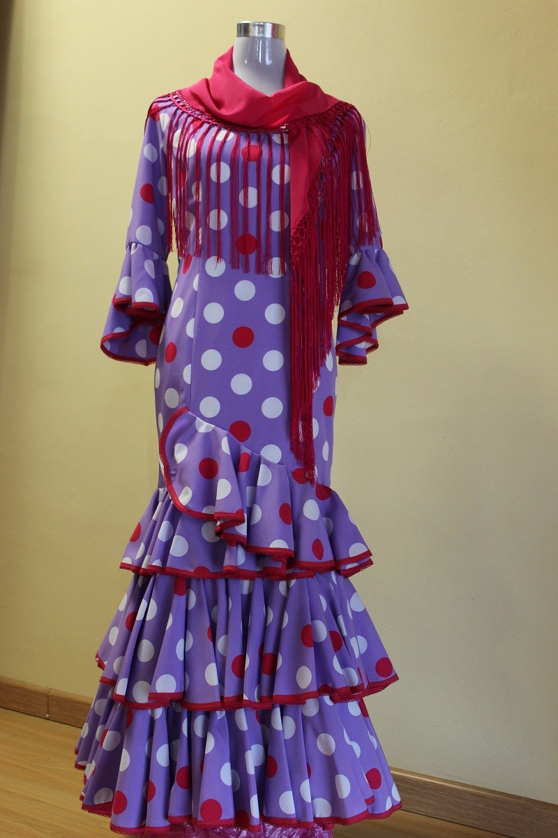 Traje de flamenca con mangas, tejido popelin biscosa, ligero, de poco peso. Con mangas y adornos en fucsia. Talla 40